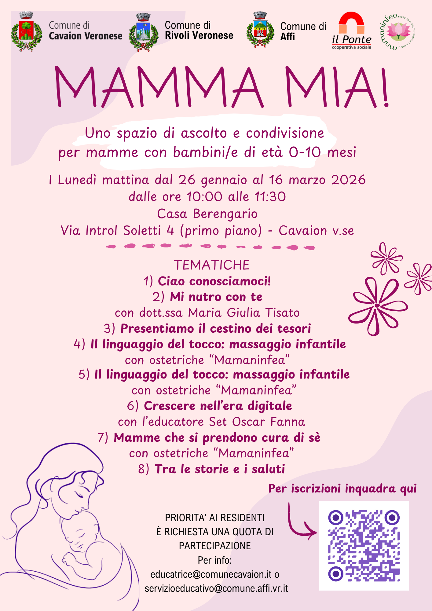 Uno spazio dedicato alle mamme e ai loro bambini/e da 0 a 10 mesi, per incontrarsi, ascoltarsi e condividere esperienze in un clima sereno e accogliente.